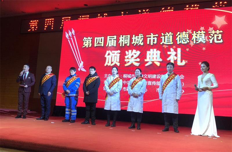 ![]() 图为第四届桐城市道德模范颁奖典礼现场。 讴歌身边好人,传递道德力量。1月29日下午,桐城市召开表彰大会,隆重表彰第四届桐城市道德模范及提名奖获得者。市委书记徐雄、市人大常委会主任王志义、市政协主席雷建鸣等为道德模范及提名奖获得者颁奖。