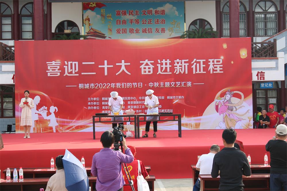 又是一轮团圆月,又是一年中秋到。9月8日下午,主题为“喜迎二十大 奋进新征程”桐城市2022年我们的节日·中秋主题文艺汇演在青草镇花戏楼举行。 文艺汇演在《狮舞中秋迎盛会》中拉开序幕,舞狮、舞蹈、打莲湘、对唱、独唱、朗诵、黄梅戏、柔力球表演、大合唱等节目轮番上演。节目精彩纷呈,喝彩掌声不断。