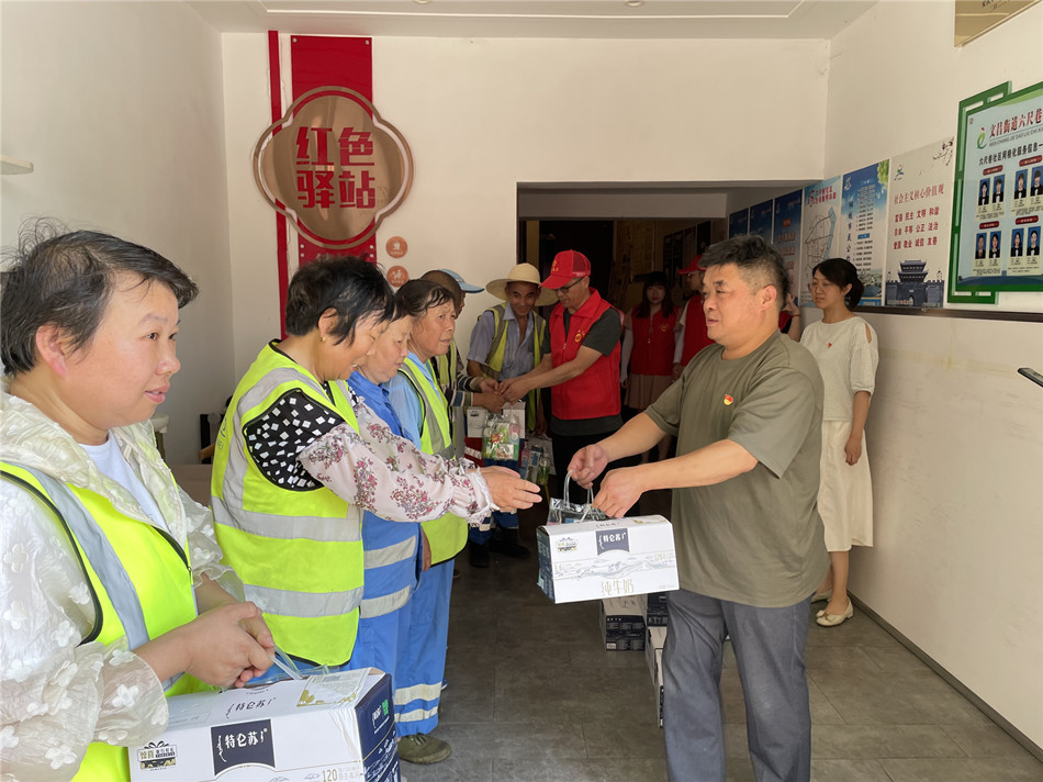 7月10日下午,文昌街道六尺巷社区联合市委编办开展“党建联盟传关爱,红色驿站送清凉”志愿服务活动,为在烈日下仍然坚守岗位的环卫工们送上一声问候、一份关心。 在社区“德邻社”红色驿站,党员志愿者们将精心准备的清凉大礼包和牛奶一起发放给辖区内的环卫工人们,感谢他们为了城市整洁美丽而付出的辛勤劳动,并叮嘱他们高温天气要做好防暑降温工作,合理安排工作时间,随时可以到社区驿站休息补水等。环卫工人们纷纷表示,感谢社区一直以来的关心和爱护,今后会努力工作,保持市容环境干净、整洁。 六尺巷社区负责人表示,社区将不断拓展红色驿站的服务内容,充分发挥驿站的服务作用,拓宽驿站的服务边界,让更多的户外工作者享受“累可歇脚、渴可喝水、冷可取暖、热可纳凉”等贴心便捷服务。(叶欣) |