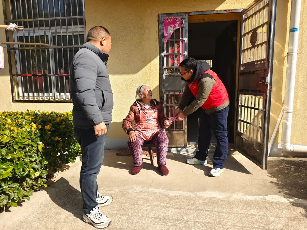 图为蔡店村工作人员为高龄老人送上“贺岁红包”。